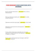 This document provides a complete collection of Food Manager Exam practice questions with their correct answers, covering essential food safety principles. It includes material on temperatures, pathogens, contamination types, sanitizing procedures, high-risk populations, HACCP concepts, and regulatory requirements. The content is comprehensive and suitable for students preparing for food manager certification exams or reviewing key food handling standards.