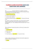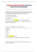 This document provides a complete set of questions and answers for the 2025 Florida Claims Adjuster licensing exam. It covers all major exam topics, including workers’ compensation, property and liability concepts, crime insurance, automobile insurance, commercial policies, bonds, ethics, licensing requirements, and regulatory standards. The material serves as a thorough study resource, offering clear explanations aligned with Florida laws and Department of Financial Services guidelines.