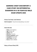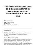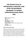 management systems, creative tasks (music, film ... i x Exam (elaborations) • 87 pages • by idahtrevis7 • uploaded 2026 Quick View i x BTEC IT LEVEL 3 - UNIT 1 • BTEC IT LEVEL 3 - UNIT 1 THE VICIOUS CYCLE OF WITHHOLDING A PEDIATRIC CASE STUDY ON ENCOPRESIS SECONDARY TO CHRONIC CONSTIPATION EXAM UPDATE 2026 (0) $36.39 0x sold This comprehensive case study examines a 4-year-old male presenting with the chief complaint of "leaking stool in his underwear," a condition clinically diagnosed as encopresis. The analysis delves into the underlying pathophysiology of overflow incontinence resulting from chronic constipation and stool withholding. It provides a detailed review of the patient's history, physical examination findings, and a differential diagnosis. The core of the study outlines a multi-phase treatment p... i x Exam (elaborations) • 11 pages • by idahtrevis7 • uploaded 2026 Quick View i x THE VICIOUS CYCLE OF WITHHOLDING A PEDIATRIC CASE • THE VICIOUS CYCLE OF WITHHOLDING A PEDIATRIC CASE THE SILENT OVERFLOW A CASE OF CHRONIC CONSTIPATION PRESENTING AS FECAL INCONTINENCE IN A 4-YEAR OLD (0) $33.99 0x sold This case study examines a 4-year-old male presenting with a chief complaint of involuntary stool leakage. While initially perceived by the parents as a behavioral issue or a failure in toilet training, the clinical presentation—characterized by daily soiling, infrequent passage of large-caliber stools, and a palpable abdominal fecal mass—is classic for encopresis with overflow incontinence secondary to chronic functional constipation. This report details the pathophysiology of rectal desens... i x Exam (elaborations) • 12 pages • by idahtrevis7 • uploaded 2026 Quick View i x THE SILENT OVERFLOW A CASE OF CHRONIC CONSTIPATIO • THE SILENT OVERFLOW A CASE OF CHRONIC CONSTIPATIO IHUMAN CASE STUDY PEDIATRIC ASTHMA EXACERBATION – BUDDY THEODORE (BT) LATEST EXAM WITH VERIFIED ANSWERS UPDATE 2026 (0) $32.99 0x sold A comprehensive analysis of a 5-year-old male with a history of intermittent asthma presenting with acute respiratory distress. This report details the subjective and objective findings, diagnostic reasoning, therapeutic intervention, and development of a comprehensive asthma action plan and follow-up strategy. i x Exam (elaborations) • 8 pages • by idahtrevis7 • uploaded 2026 Quick View i x IHUMAN CASE STUDY PEDIATRIC ASTHMA EXACERBATION • IHUMAN CASE STUDY PEDIATRIC ASTHMA EXACERBATION BURNING CHEST DISCOMFORT A CASE STUDY ON DIFFERENTIAL DIAGNOSIS IN A 58-YEAR-OLD MALE EXAM UPDATE 2026 (0) $26.39 0x sold This presentation reviews the case of Jacob Abraham, who presents with substernal burning chest pain. While the history is suggestive of GERD, his age and the acute nature of the symptoms necessitate ruling out Acute Coronary Syndrome. We will walk through the critical steps of the initial assessment, physical exam findings, diagnostic workup, and the development of a comprehensive SOAP note and management plan. i x Exam (elaborations) • 10 pages • by idahtrevis7 • uploaded 2026 Quick View i x BURNING CHEST DISCOMFORT A CASE STUDY ON DIFFEREN • BURNING CHEST DISCOMFORT A CASE STUDY ON DIFFEREN 2026 EVOLVE HESI FUNDAMENTALS EXAM AND RN HESI EVOLVE FUNDAMENTALS COMPLETE ALL QUESTIONS AND CORRECT ANSWERS (0) $24.99 0x sold 2026 EVOLVE HESI FUNDAMENTALS EXAM AND
