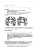 Zeer uitgebreide samenvatting over parkinson. In deze samenvatting wordt de directe en de indirecte pyramidale pathway van het nigrostriatale circuit besproken zoals bij een gezond persoon. Vervolgens wordt de pathogenese van parkinson, de oorzaken van neurale schade, genetische factoren, bloedhersen barrière behandeld. Ten slotte komt het werkingsmechanisme en de bijwerkingen op korte en lange termijn van levodopa, entacapone (COMT-inhibitor), domperidon, pramipexol (dopamine receptor agonist)...