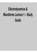 The guide covers key concepts in Electrocardiography, including waveform analysis, common arrhythmias, and the operation of ECG machines. It also emphasizes patient preparat... i x Exam (elaborations) • 9 pages • by masterstudy • uploaded 2026 Quick View i x Electrocardiography • Electrocardiography Electrodynamics & Waveforms Lecture 1 – Study Guide | Electromagnetic Waves and Signal Basics (0) $15.99 0x sold This Electrodynamics & Waveforms Lecture 1 study guide introduces foundational concepts in Electrodynamics and waveform analysis, focusing on the behavior of electromagnetic signals and their applications. The material covers key topics such as wave properties (frequency, wavelength, amplitude), sinusoidal waveforms, and the relationship between electric and magnetic fields in wave propagation.