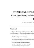 This document contains 60 verified multiple-choice questions and answers from the ATI Mental Health Exam, updated for the 2025–2026 academic cycle. It covers high-yield psychiatric topics including schizophrenia, bipolar disorder, anxiety, PTSD, suicide prevention, therapeutic communication, psychopharmacology, and ethical care. Each question includes the correct answer and rationale, making it ideal for NCLEX-style exam preparation and clinical mastery. The content reflects current evidence-b...