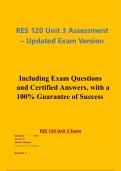 Dit document bevat de volledige inhoud van de RES 120 Unit 3 Assessment, inclusief alle 100 examenvragen met gecertificeerde antwoorden. Het behandelt anatomie, positionering, technieken en modaliteiten binnen abdominale beeldvorming. De inhoud is volledig afgestemd op de actuele examenstof en vormt een complete en gestructureerde bron voor studenten die zich voorbereiden op de RES 120-toets.