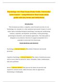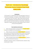 This document provides a complete, exam-focused overview of core Psychology 100 concepts in a clear question-and-answer format. It covers major topics including biological psychology, learning and conditioning, memory, cognition, development, personality, social psychology, psychological disorders, and treatment approaches. The study guide is des...
