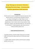 This document contains comprehensive practice questions with detailed answers on drug therapy in geriatric patients, focusing on nursing pharmacology. Topics include pharmacokinetics and pharmacodynamics in older adults, polypharmacy, Beers criteria, adverse drug reactions, renal and hepatic changes, and medication adherence. The material is well suited for exam preparation...
