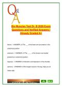 This document contains over 70 verified questions and answers from a graded A+ exam on muscle anatomy and physiology for the BIO 2026 course. It offers a detailed overview of skeletal, smooth, and cardiac muscle types, muscle locations, functions, and naming conventions. Students will explore key concepts such as muscle origin and insertion, types of movement (flexion, extension), roles (agonist, antagonist, synergist), and anatomical terminology used to classify muscles by shape, direction, siz...