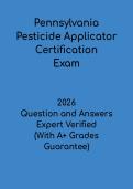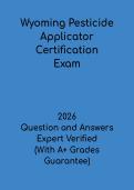 Questionans On this page, you find all documents, package deals, and flashcards offered by seller QuestionAns. 1188 Documents 0 Flashcards 0 Package deal Community 1 Followers 2 Following 1 Reviews received 0 0 1 0 0 2 months ago • ryannep3987 CDCES 2026 Mock Exam – Certified Diabetes Care and Education Specialist Practice Test 1188 items Everything Documents Flashcards Package deal Best sold Newest Rating Van Miller Intro to Neuro Exam 1 Study Guide | Neuroscience Prep 2026 (0) $9.99 0x sold This Van Miller Intro to Neuro Exam 1 Study Guide is a comprehensive resource for students preparing for the introductory neuroscience exam. It includes practice questions, key concepts, and detailed explanations covering neuroanatomy, nervous system functions, brain structures, and fundamental neurological processes. Designed to reinforce understanding, improve retention, and boost exam confidence, this guide helps students effectively prepare for Van Miller’s Intro to Neuro Exam 1 and excel ... i x Exam (elaborations) • 13 pages • by QuestionAns • uploaded 2026 Quick View i x Van Miller • Van Miller WGU Health, Fitness, and Wellness C458 Study Guide 2026 (0) $9.99 0x sold This WGU Health, Fitness, and Wellness C458 Study Guide is a complete resource for students preparing for the C458 course exam. It includes practice questions, key concepts, and detailed explanations covering health promotion, physical fitness, nutrition, wellness strategies, and lifestyle management. Designed to reinforce knowledge, enhance understanding of wellness principles, and boost exam confidence, this guide helps students effectively prepare for the WGU C458 Health, Fitness, and Wellnes... i x Exam (elaborations) • 20 pages • by QuestionAns • uploaded 2026 Quick View i x Health, Fitness and Wellness C458 • Health, Fitness and Wellness C458 Wyoming Pesticide Applicator Certification Study Guide 2026 (0) $9.99 0x sold This Wyoming Pesticide Applicator Certification Study Guide is a comprehensive resource for individuals preparing for the state pesticide applicator licensing exam. It includes practice questions, key concepts, and detailed explanations covering safe pesticide handling, application methods, environmental protection, equipment usage, and Wyoming-specific regulatory compliance. Designed to reinforce essential knowledge, enhance test-taking skills, and boost confidence, this guide helps candidates ... i x Exam (elaborations) • 39 pages • by QuestionAns • uploaded 2026 Quick View i x Wyoming Pesticide Applicator • Wyoming Pesticide Applicator OSSF Installer 2 Exam Study Guide | Updated 2026 Questions & Answers (0) $9.99 0x sold This OSSF Installer 2 Exam Study Guide (Updated 2026) is a comprehensive resource for individuals preparing for the Onsite Sewage System Installer 2 certification exam. It includes practice questions, key concepts, and detailed answers covering septic system installation, maintenance, regulations, safety standards, and inspection procedures. Designed to reinforce technical knowledge, improve practical skills, and boost exam confidence, this guide helps candidates effectively prepare for the OSSF... i x Exam (elaborations) • 9 pages • by QuestionAns • uploaded 2026 Quick View i x Ossf installer 1 • Ossf installer 1 Pesticide Applicator Certification Sample Questions | Exam Prep 2026 (0) $9.99 0x sold This Pesticide Applicator Certification Sample Questions guide is a targeted resource for individuals preparing for pesticide applicator licensing exams. It includes a comprehensive set of sample questions with detailed explanations covering pesticide safety, application methods, equipment handling, environmental protection, and regulatory compliance. Designed to reinforce knowledge, improve exam readiness, and boost confidence, this guide helps candidates effectively practice and prepare for su... i x Exam (elaborations) • 18 pages • by QuestionAns • uploaded 2026 Quick View i x pesticide applicator • pesticide applicator Pesticide Applicator Certification Study Guide | Exam Prep 2026 (0) $9.99 0x sold This Pesticide Applicator Certification Study Guide is a comprehensive resource for individuals preparing for state or national pesticide applicator licensing exams. It includes practice questions, key concepts, and detailed explanations covering safe pesticide handling, application techniques, environmental protection, equipment use, and regulatory compliance. Designed to reinforce essential knowledge, improve test-taking skills, and boost exam confidence, this guide helps candidates effectivel... i x Exam (elaborations) • 28 pages • by QuestionAns • uploaded 2026 Quick View i x pesticide applicator • pesticide applicator Pharmacology Midterm Test Bank 1 | Nursing Exam Prep 2026 (0) $9.99 0x sold This Pharmacology Midterm Test Bank 1 is a focused resource for nursing students preparing for pharmacology midterm exams. It includes practice questions, key concepts, and detailed explanations covering medication classifications, mechanisms of action, side effects, drug interactions, and patient-centered care principles. Designed to reinforce knowledge, improve clinical decision-making, and boost exam confidence, this test bank helps students effectively prepare for pharmacology midterms and e... i x Exam (elaborations) • 16 pages • by QuestionAns • uploaded 2026 Quick View i x Pharmacology • Pharmacology Pharmacology Study Guide | Patient-Centered Nursing Process 2026 (0) $9.99 0x sold This Pharmacology: A Patient-Centered Nursing Process Approach Study Guide is a comprehensive resource for nursing students preparing for pharmacology exams. It includes practice questions, key concepts, and detailed explanations covering medication administration, drug classifications, mechanisms of action, side effects, and patient-centered care principles. Designed to reinforce knowledge, improve clinical decision-making, and boost exam confidence, this 