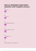 HESI A2 ENTRANCE EXAM MATH questions with complete answers. QS 1 2/3 + 4/7 - n Ans 2 5/21 Qs 1.25 X 2.0 - n Ans 2.5 Qs 8.08 change into a fraction. - n Ans 8 2/25 Qs Change 1/1000 into a ratio - n Ans 1:1000 Qs 0.2 divided by 1.1 - n Ans 0.18