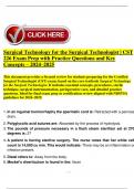 This document delivers a full set of practice questions and a complete content review tailored for the 2024–2025 Certified Surgical Technologist (CST) exam by NBSTSA. It includes realistic multiple-choice questions with detailed answer explanations, covering all exam topics such as preoperative preparation, intraoperative procedures, surgical case management, asepsis, anatomy, and pharmacology. Designed for candidates seeking both knowledge reinforcement and exam readiness.
