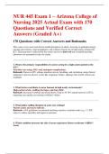 This document contains the complete NUR 445 Exam 1 from Arizona College of Nursing for 2025, featuring 170 multiple-choice questions with correct, detailed, and verified answers. The exam covers essential nursing concepts such as patient safety, evidence-based practice, health promotion, disease prevention, pharmacology, pathophysiology, and nursing interventions across diverse populations. Each question includes a clear explanation to strengthen understanding and support exam readiness. Already...