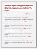 NURS 6630 Midterm Exam Psychopharmacologic Approaches to Treatment of Psychopathology latest update Walden University Questions And Answers Regulates dopamine release from presynaptic neurons. - ANSWER -D2 autoreceptor Enzyme that breaks down dopamine in neurons. - ANSWER -MAO-B Medications affecting mental state and behavior. - ANSWER -Psychotropic drugs Hallucinations or delusions experienced by patients. - ANSWER -Symptoms of psychosis Enhancement of...