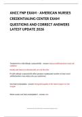 This document provides the most recent and complete collection of ANCC Family Nurse Practitioner (FNP) Exam questions and verified answers, updated for 2026. It covers all major topics tested by the American Nurses Credentialing Center, including pharmacology, pathophysiology, endocrinology, cardiology, dermatology, pediatrics, geriatrics, women’s health, psychiatry, and preventive care. Each question is paired with its correct answer and clinical rationale, making it ideal for review and exam...