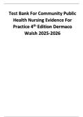 This document is a complete test bank for Community Public Health Nursing: Evidence for Practice, 4th Edition by Dermaco and Walsh. It includes multiple-choice questions, answers, and detailed feedback explanations for all 25 chapters, covering topics such as public health systems, epidemiology, infectious diseases, health policy and reform, community preparedness, palliative and end-of-life care, and faith-based approaches. Designed to align with the academic year, it provides comprehensive ex...