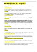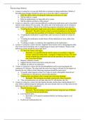 White7 On this page, you find all documents, package deals, and flashcards offered by seller White7. 203 Documents 0 Flashcards 0 Package deal Community 0 Followers 0 Following 203 items Everything Documents Flashcards Package deal Best sold Newest Rating ATI NR293 Pharmacology Midterm Best Mark A (0) $32.99 0x sold 1 Pharmacology Midterm 1. A nurse is caring for a 4-year-old child who is resistant to taking medication. Which of the following strategies should the nurse use to elicit the child’s cooperation? a. Offer the child a choice of taking the medication with juice or water b. Tell the child it is candy c. Hide the medications in a large dish of ice cream d. Tell the child he will have a shot instead 2. A nurse is caring for a client who has difficulty swallowing medications and is prescribed enteri... i x Exam (elaborations) • 18 pages • by White7 • uploaded 2023 Quick View i x Chamberlain College Of Nursing • ATI NR293 Pharm NURSING NUR280/NUR Nursing III Rated A+ (0) $33.99 0x sold Nursing III Final Chapters Chapter 35 For the client who is at risk for stroke, the most important guideline the nurse should teach is to: monitor blood pressure The family of a client diagnose d with a stroke asks the nurse if this health problem is very common. The nurse should respond that in the United States a person has a stroke every: 40 seconds A client is being evaluated for a stroke. The nurse knows that one of the easiest and most common diagnostic tests used to differentiate between ... i x Exam (elaborations) • 7 pages • by White7 • uploaded 2023 Quick View i x Chamberlain College Of Nursing • NURSING NUR280/NUR N3 NURSING NUR280/NUR N3 Graded A+ (0) $32.99 0x sold N3: Final Exam Study Guide 1. CAM (Complementary & Alternative Medicine) a. What is Complementary? i. “In addition to…” modern medicine b. What is Alternative? i. “Instead of…” modern medi cine c. Define “Chi” i. Chinese life force that provides warmth and protection from illness and injury. d. Reiki i. Use of hands to correct energy fields/chakras. Energy flows from universe into patient. Can help increase WBC and RBC production. Realignment of energy flow. e. Ayurveda i. Indian... i x Exam (elaborations) • 19 pages • by White7 • uploaded 2023 Quick View i x Chamberlain College Of Nursing • NURSING NUR280/NUR N3 NUR 2790 Exam_Final_ Best Series (0) $32.99 0x sold Final Exam Content Guide 1. Stroke – CVA – Brain attack disruption of cerebral blood flow secondary to ischemia, hemorrhage, brain attack, or embolism 1) Hemorrhagic – ruptured artery or aneur y sm = ischemia and ↑ICP caused by expanding collection of blood. Prognosis poor. 2) Thrombotic – d/t development of blood clot on an atherosclerotic plaque in a cerebral artery. The clot gradually shuts off the artery causing ischemia distal to the occlusion. Symptoms evolve over several hours t... i x Exam (elaborations) • 17 pages • by White7 • uploaded 2023 Quick View i x Chamberlain College Of Nursing • NUR 2790 NURSING NUR3508 N3 - Exam 3 Highest Rank A+ (0) $31.99 0x sold Chapter 10: Concepts of Emergency and Disaster Preparedness MULTIPLE CHOICE 1. A hospital responds to a local mass casualty event. Which action should the nurse supervisor take to prevent staff pos t- traumatic stress disorder during a mass casualty event? a. Provide water and healthy snacks for energy throughout the event. b. Schedule 16-hour shifts to allow for greater rest between shifts. c. Encourage counseling upon deactivation of the emergency response plan. d. Assign staff to different ro... i x Exam (elaborations) • 58 pages • by White7 • uploaded 2023 Quick View i x Chamberlain College Of Nursing • NUR3508 N3 NR 2224 Exam 1 Best Grade A+ (0) $32.99 0x sold NR 2224 Exam 1 Questions And Answers 1. Which is the five-step process that professional nurses use when caring for clients? The nursing process 2. The nurse palpates a client’s radial pulse as 52 b eats per minute. The client spear alert and oriented and in no distress. Which action by the nurse best demonstrates effective use of the nursing process? Use the stethoscope to listen for the radial pulse i x Exam (elaborations) • 5 pages • by White7 • uploaded 2023 Quick View i x Chamberlain College Of Nursing • NR 2224 N3 - Exam 3 Top Notch Score A+ (0) $33.99 0x sold N3 - Exam 3 Questions And Answers 1. A client is learning about cholesterol. The nurse explains that the good cholesterol transports plasma cholesterol away from plaques and to the liver for met aboli sm. This type of cholesterol is called: 1. high-density lipoprotein. 2. low-density lipoprotein. 3. very-high-density lipoprotein. 4. very-low-density lipoprotein. 2. A client has a blood pressure of 132/82 mmHg and a triglyceride level of 160 mg/dL. Based on these results, the nurse knows that the... i x Exam (elaborations) • 9 pages • by White7 • uploaded 2023 Quick View i x Chamberlain College Of Nursing • N3 - PN3-FINAL (0) $34.99 0x sold Cardiac Normal cardiac output- Normal cardiac output is 60-100 beats per minute. If below 60 is brady cardia and the patient is at risk for poor perfusion. Cardiac output is defined as the amount of b lood pumped from the left ventricle each minute. Remember that arrhythmia is a deviation from a normal rhythm and a dysrhythmia is a disturbance in the normal rhythm. Medications for: contractility, maintaining normal blood pressure, various tachycardias, bradycardias, different degrees of AV block... i x Exam (elaborations) • 15 pages • by White7 • uploaded 2023 Quick View i x Chamberlain College Of Nursing • PN3- MDA 224 2018 HESI EXIT V3 Top Score (0) $36.99 0x sold 2018 HESI EXIT V3 1. A 64 year-old client scheduled for surgery with a general anesthetic refuses to remove a set of dentures prior to leaving the unit for the operating room. What would be the most a ppropriate intervention by the nurse? A) Explain to the client that the dentures must come o