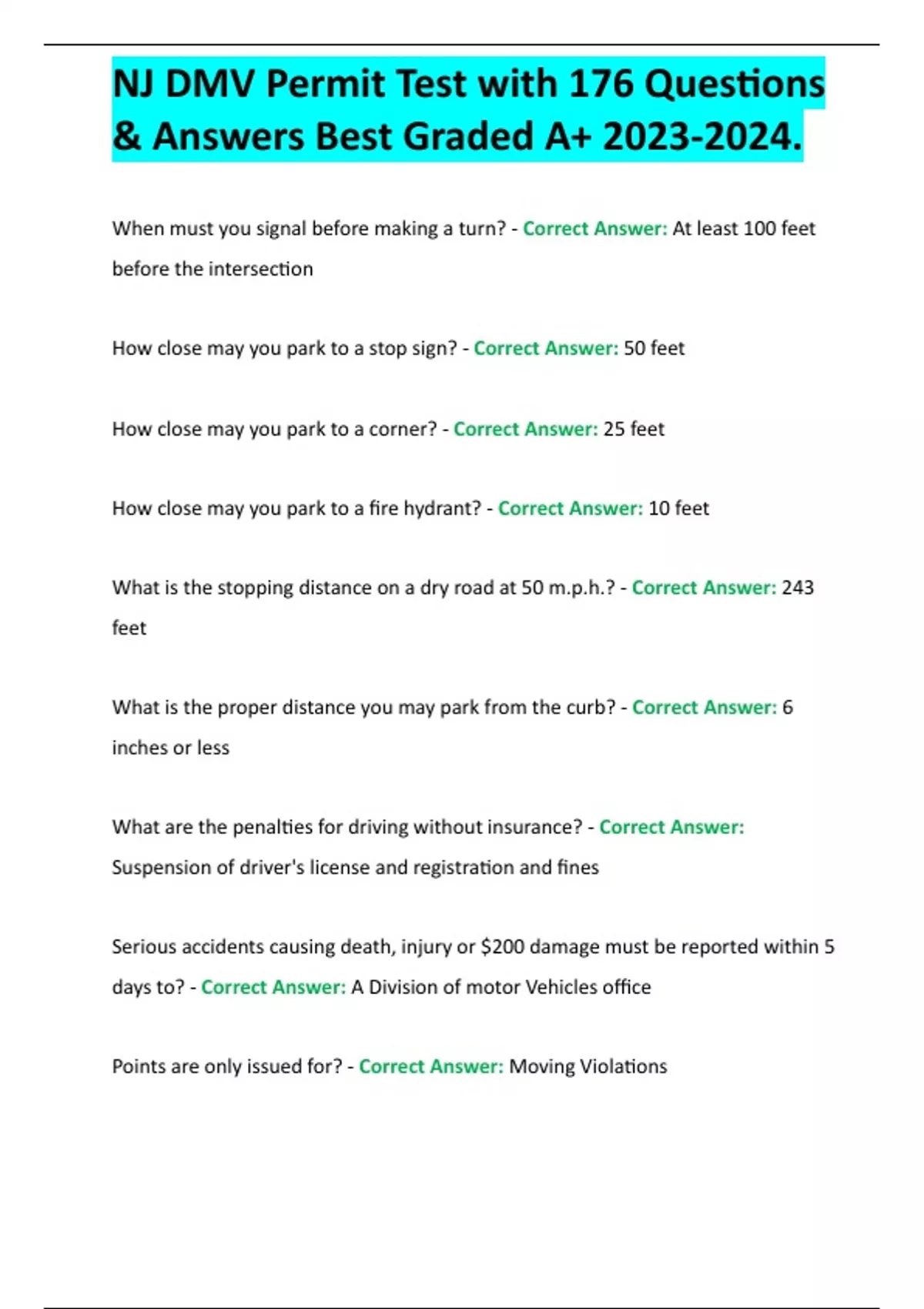 1 Exam (elaborations) DMV New Jersey with Over 266 Questions with Verified Answers Update 2023. 2 Exam (elaborations) NJ Drivers Test Questions (84 Terms) with Complete Solutions . 3 Exam (elaborations) NJ Permit Test 2021Study Review Questions and Answers with Correct Solutions 2023. 4 Exam (elaborations) NJ MVC Permit Test 2022 with 1
