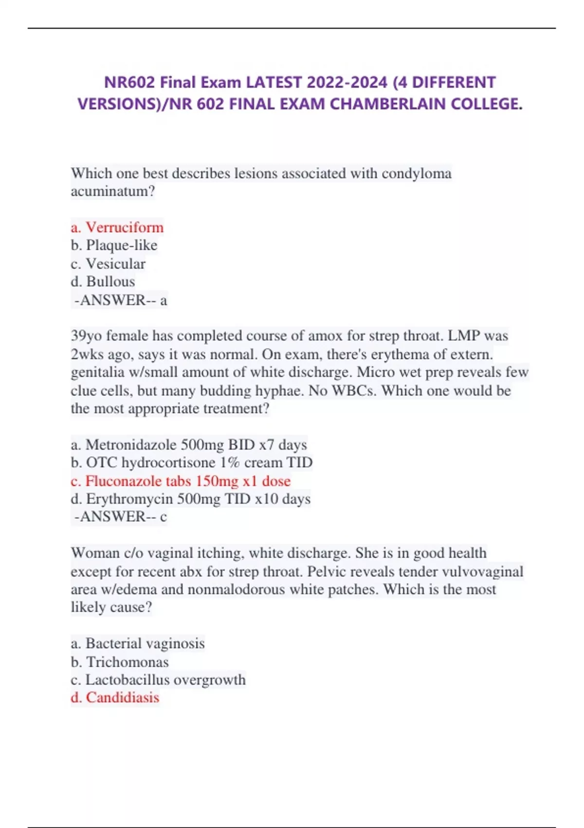 NR602 Final Exam LATEST (4 DIFFERENT VERSIONS)/NR 602 FINAL EXAM CHAMBERLAIN COLLEGE