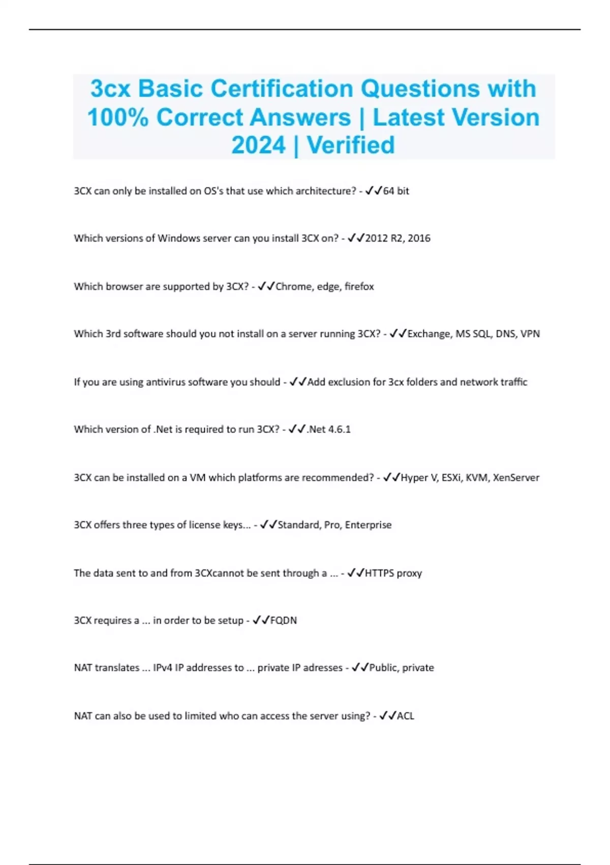 3CX Academy, Basic Certification, Install 3CX Questions with 100% Correct Answers | Latest Version 2024 | Verified