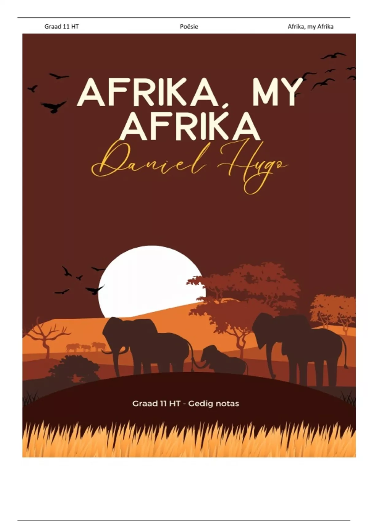 Die bondel sluit 3 voorgeskrewe graad 11 gedigte in Afrika, my Afrika, Gebed tot die bome en Hooglied vir die verlede