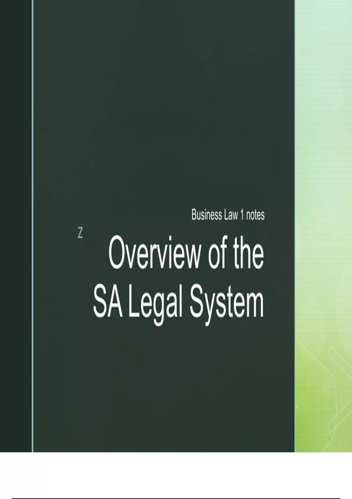PowerPoint summaries of UCT's Business Law 1 (CML1001F) module based on the 2024 year of teaching. This package includes extensive summaries of the South African legal system, principles and contents of contracts under South African law, and the laws of purchase and sale. It is organised in PowerPoint to easily read and navigate.