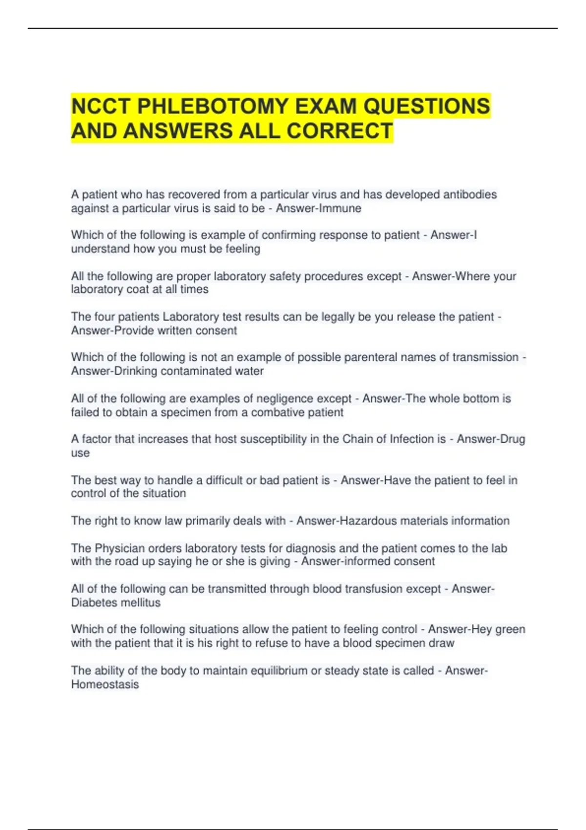 BUNDLE FOR NCCT PHLEBOTOMY EXAM QUESTIONS AND ANSWERS
