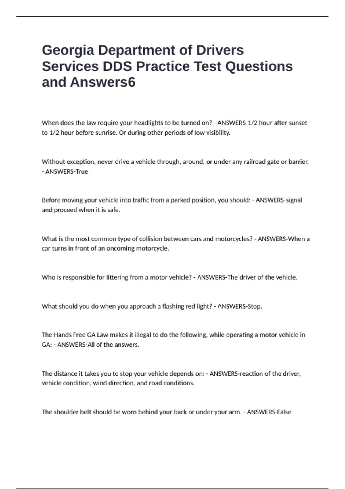 Georgia Department of Drivers Services DDS Practice Test Questions and Answers