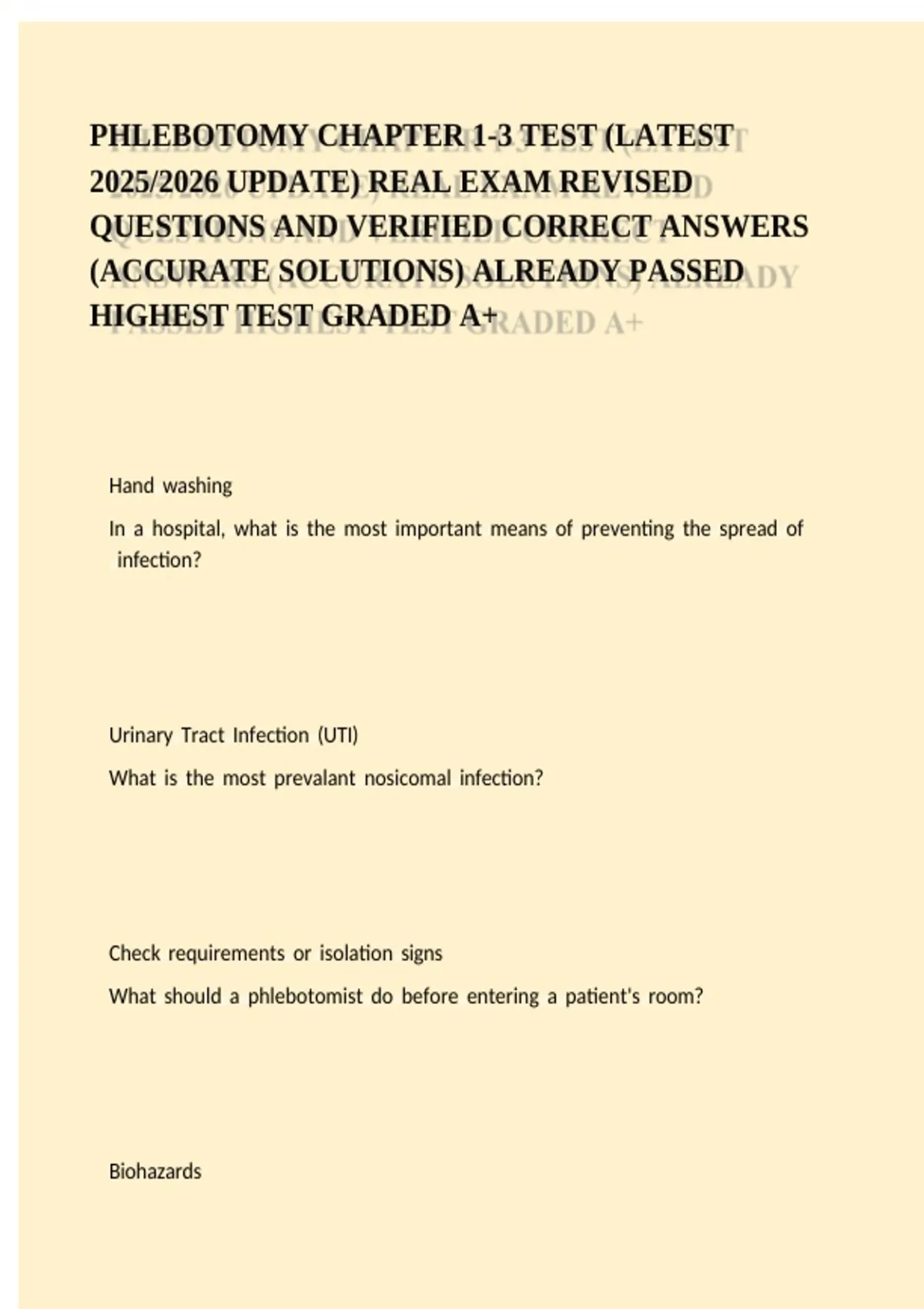 PHLEBOTOMY CHAPTER 1-3 TEST (LATEST 2025/2026 UPDATE) REAL EXAM REVISED QUESTIONS AND VERIFIED CORRECT ANSWERS (ACCURATE SOLUTIONS) ALREADY PASSED HIGHEST TEST GRADED A+