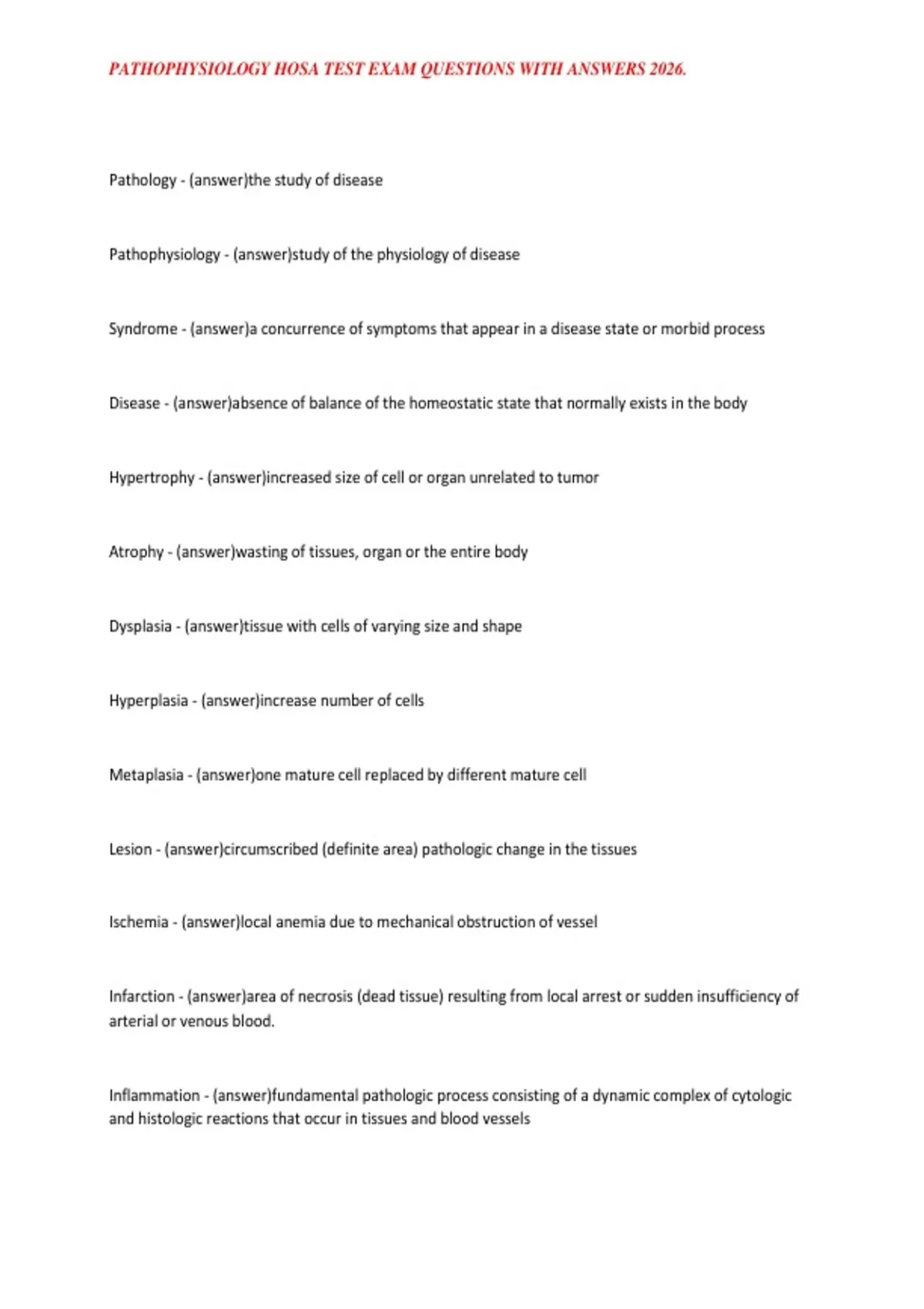 HOSA PATHOPHYSIOLOGY NOTES EXAM QUESTIONS WITH ANSWERS 2026.