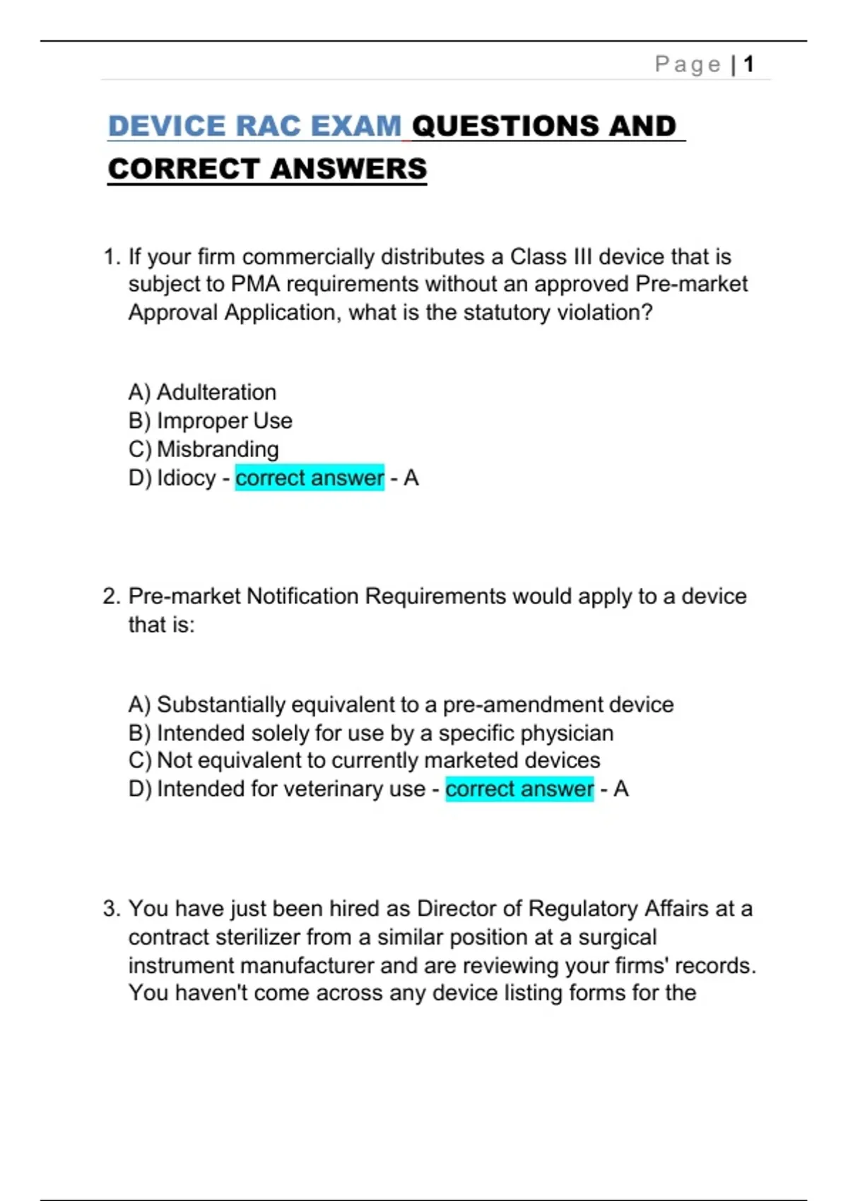a comprehensive collection of Device RAC exam questions with correct answers, designed to support preparation for medical device regulatory affairs certification. It covers FDA medical device regulations, 510(k) submissions, PMA and HDE pathways, IDE requirements, QSR and GMP compliance, MDR reporting, recalls and corrective actions, labeling, inspections, and regulatory strategy, making it a thorough and exam-focused study resource for regulatory professionals.
