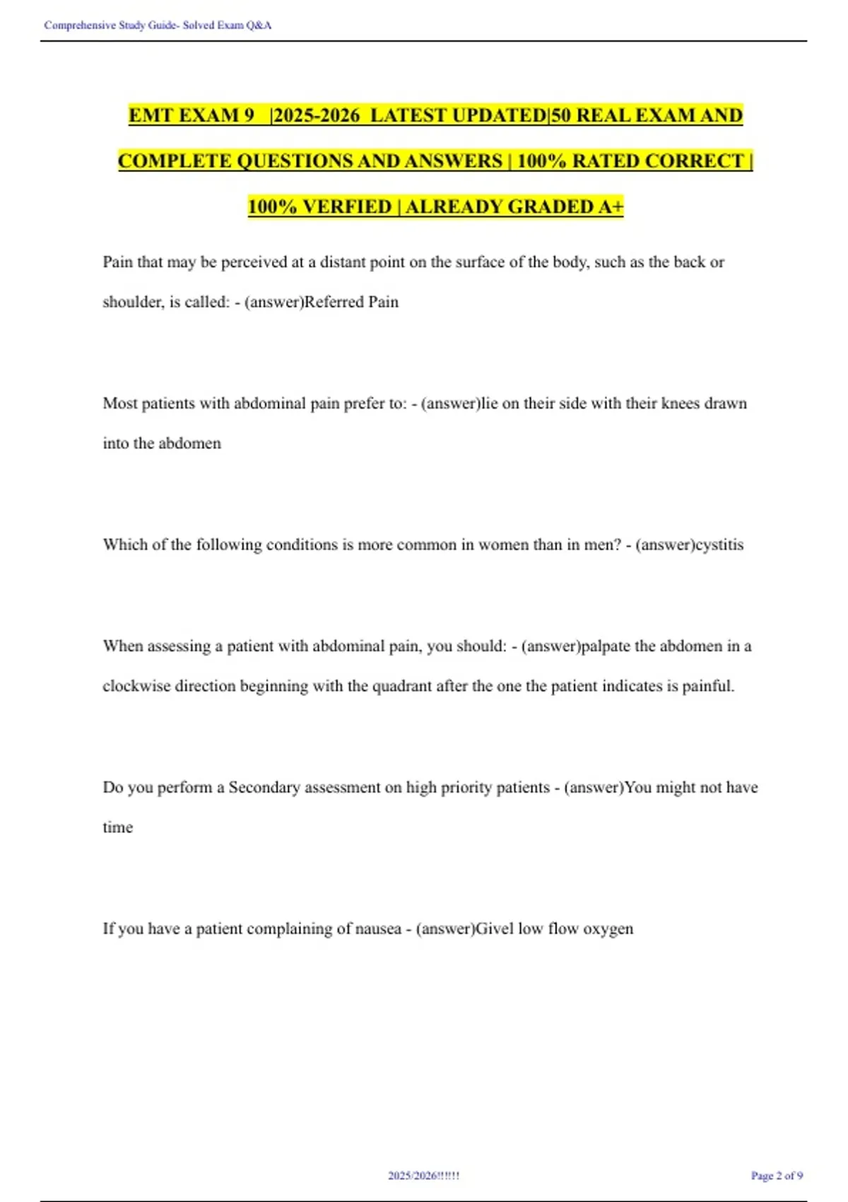 EMT EXAM 9 |2025-2026 LATEST UPDATED|50 REAL EXAM AND