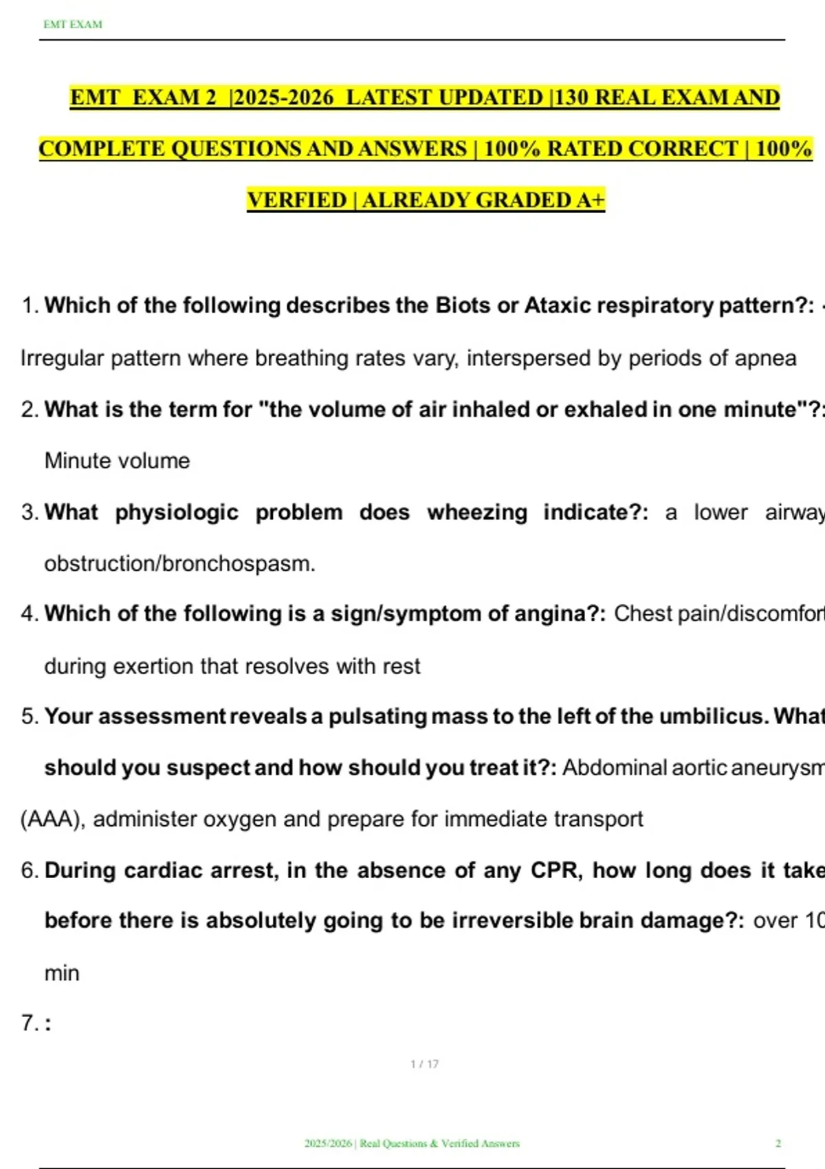 EMT Exam 2 2025/ 2026 | 130 Practice Exam Questions and Verified Answer Key 100% Correct | Latest Updated Study Guide with Step-by-Step Explanations for Certification Success