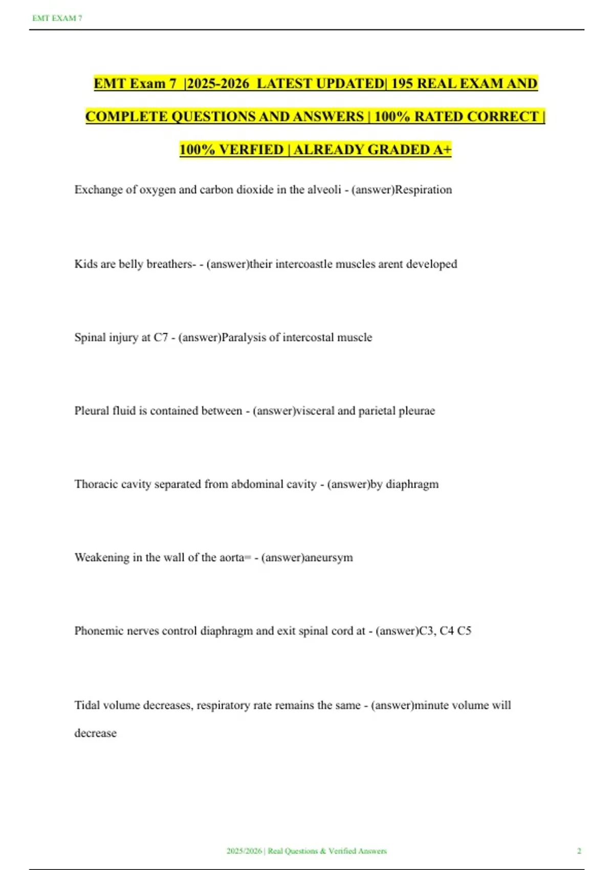 EMT Exam 7 2025/ 2026 | 195 Practice Exam Questions and Verified Answer Key 100% Correct | Latest Updated Study Guide with Step-by-Step Explanations for Certification Success