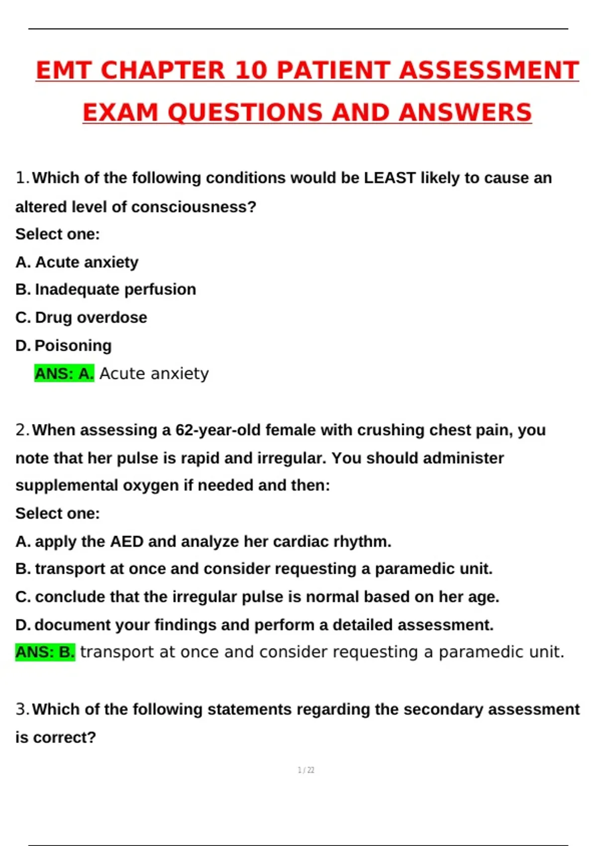 EMT CHAPTER 10 PATIENT ASSESSMENT Latest 2026 Actual Questions and Verified Answers (2026 / 2027) A+ Grade 100% Guarantee Verified by Experts EMT exam questions and correct answers, EMT practice test with answers, EMT 2025 exam prep, EMT 2026 updated study guide, EMT Block 1 triage quiz answers, EMT triage practice questions, EMT Chapters 1–32 study guide, EMT Exam 1 Chapters 1–5 questions, EMT Exam 1 practice questions, EMT HOSA EMT practice exam, EMT medical practice exam questions, EMT anatomy and physiology exam review, EMT medical terminology practice questions, EMT patient assessment Chapter 10 questions, EMT primary and secondary assessment exam, EMT emergency medical care fundamentals, EMT EMS systems Chapter 1 review, EMT intro to emergency medical care exam, EMT vital signs practice questions, EMT airway management exam prep, EMT oxygen therapy questions, EMT bleeding and shock practice, EMT trauma assessment exam prep, EMT medical emergencies practice questions, EMT pediatric patient assessment review, EMT geriatric care exam questions, EMT obstetric emergencies practice, EMT EMS operations exam review, EMT ambulance operations questions, EMT legal and ethical issues EMT exam, EMT documentation and reporting practice, EMT infection control exam questions, EMT anatomy physiology EMT test prep, EMT pharmacology basics exam review, EMT medication administration questions, EMT triage tagging practice exam, EMT disaster response questions, EMT mass casualty incidents exam, EMT NREMT practice questions, EMT cognitive exam prep 2025, EMT psychomotor exam review, EMT skills exam practice, EMT written EMT exam questions, EMT mock exam with rationales, EMT study guide PDF download, EMT exam cram review, EMT high-yield EMT questions, EMT full course review study guide, EMT comprehensive practice exam, EMT latest exam questions 2025, EMT verified answers study guide, EMT full practice and prep guide EMT Block 1 triage quiz, EMT triage practice questions, EMT Chapter 1 to 32 study guide, EMT exam questions and correct answers, EMT Chapter 1 EMS systems review, EMT intro to emergency medical care exam, EMT patient assessment Chapter 10 questions, EMT Exam 1 Chapters 1–5 practice, EMT Exam 1 questions and answers, EMT HOSA practice questions, EMT medical practice exam, EMT anatomy and physiology review, EMT medical terminology exam questions, EMT full EMT exam prep 2025, EMT updated study guide 2026, EMT practice test with answers, EMT certification exam prep, EMT first responder exam questions, EMT emergency care fundamentals review, EMT trauma assessment practice, EMT medical assessment exam prep, EMT scene size up questions, EMT primary assessment practice, EMT secondary assessment review, EMT vital signs practice questions, EMT airway management exam prep, EMT oxygen therapy questions