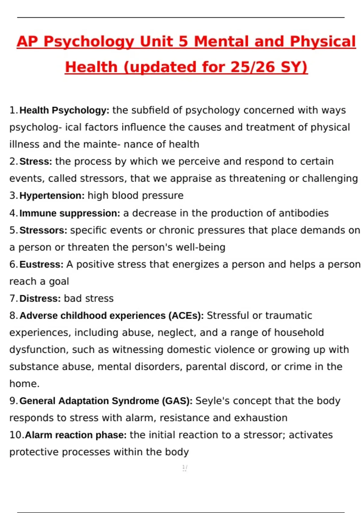 AP Psychology Unit 5 Mental and Physical Health (updated for 24-25 SY) Newest 2026 Actual Questions and Verified Answers 2026 / 2027 A+ Verified by Experts AP Psychology practice questions and answers, AP Psychology exam prep 2025, AP Psychology updated study guide 2026, AP Psychology Units 1–5 review, AP Psychology Unit 1 study guide, AP Psychology introduction to psychology review, AP Psychology biological bases of behavior practice, AP Psychology Unit 1 multiple choice, AP Psychology Unit 2 cognition study guide, AP Psychology Unit 2 reading guide, AP Psychology Unit 2 practice questions, AP Psychology memory and thinking review, AP Psychology Unit 3 development and learning review, AP Psychology Unit 3 multiple choice questions, AP Psychology sensation and perception practice, AP Psychology learning theories exam questions, AP Psychology Unit 3 vocabulary review, AP Psychology Unit 4 social psychology study guide, AP Psychology Unit 4 personality review, AP Psychology Unit 4 practice questions, AP Psychology Unit 4 vocabulary practice, AP Psychology social influence exam questions, AP Psychology personality theories review, AP Psychology Unit 5 mental and physical health review, AP Psychology Unit 5 practice questions, AP Psychology Unit 5 vocab study guide, AP Psychology disorders and treatment review, AP Psychology health psychology exam prep, AP Psychology Unit 5 multiple choice, AP Psychology College Board aligned review, AP Psychology mock exam questions, AP Psychology multiple choice practice PDF, AP Psychology vocab lists with definitions, AP Psychology high-yield exam questions, AP Psychology test prep bundle, AP Psychology exam questions explained, AP Psychology class notes study guide, AP Psychology learning and conditioning practice, AP Psychology cognition exam questions, AP Psychology sensation and perception test prep, AP Psychology social psychology exam review, AP Psychology mental health exam questions, AP Psychology personality identity review, AP Psychology stress and coping practice, AP Psychology disorders diagnosis review, AP Psychology therapy treatment exam, AP Psychology final exam review guide, AP Psychology last minute review, AP Psychology study guide PDF download, AP Psychology comprehensive practice exam, AP Psychology full practice and prep guide 2025, AP Psychology verified answers study guide, AP Psychology unit tests bundle, AP Psychology exam readiness review AP Psychology Unit 1 study guide, AP Psychology Unit 1 introduction to psychology review, AP Psychology biological bases of behavior practice, AP Psychology Unit 1 multiple choice questions, AP Psychology Unit 2 cognition study guide, AP Psychology Unit 2 reading guide, AP Psychology Unit 2 practice questions, AP Psychology Unit 2 memory and thinking review, AP Psychology Unit 3 development and learning review, AP Psychology Unit 3 practice questions, AP Psychology Unit 3 multiple choice, AP Psychology sensation and perception practice, AP Psychology learning theories exam questions, AP Psychology Unit 3 vocab review, AP Psychology Unit 4 social psychology study guide, AP Psychology Unit 4 personality review, AP Psychology Unit 4 practice questions, AP Psychology Unit 4 vocabulary practice