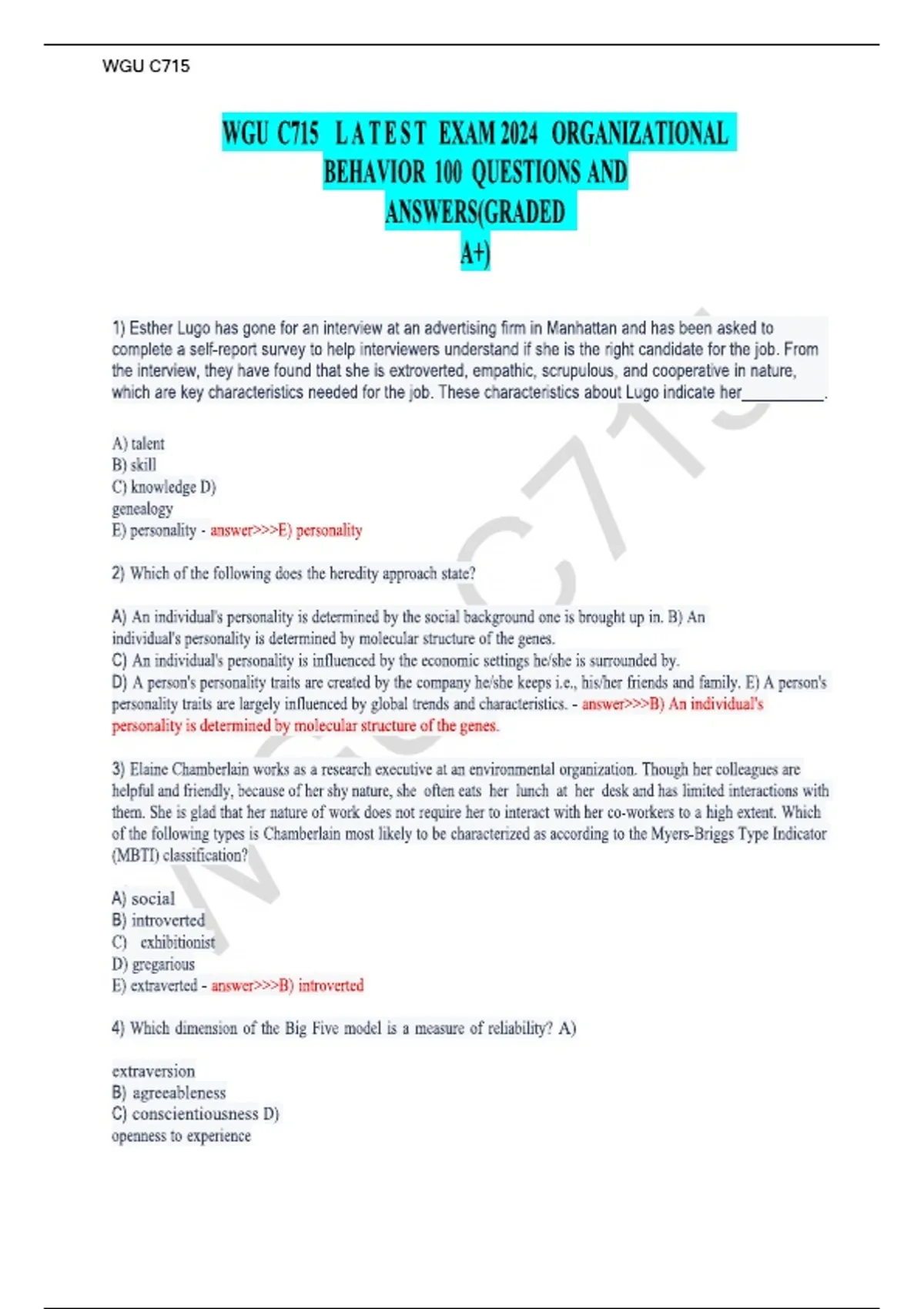 WGU C715 Organizational Behavior Latest Exam | Verified Questions and Correct Answers, A+ Graded, Detailed Rationales, Updated WGU Study Guide PDF