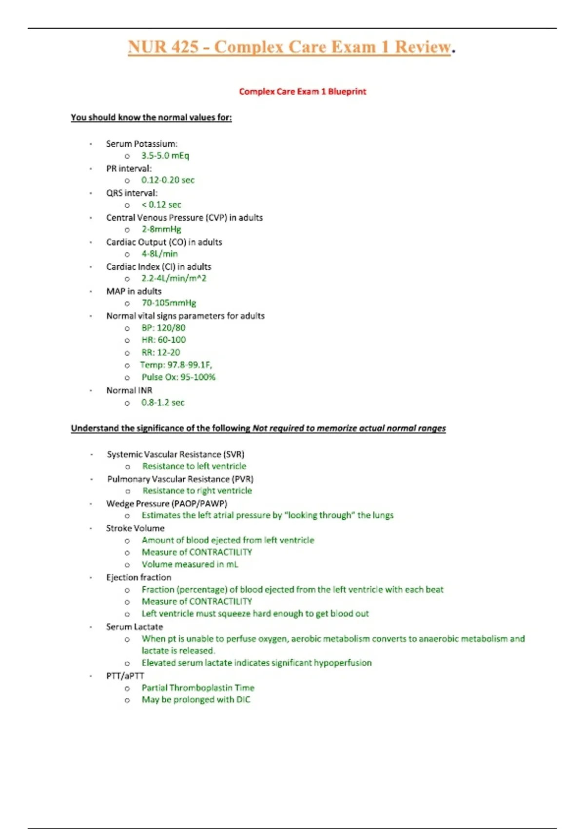 NUR 425 Complex Care Exam 1 Review | Verified Questions and Correct Answers, Detailed Rationales, A+ Explanations, Exam-Focused Nursing Study Guide