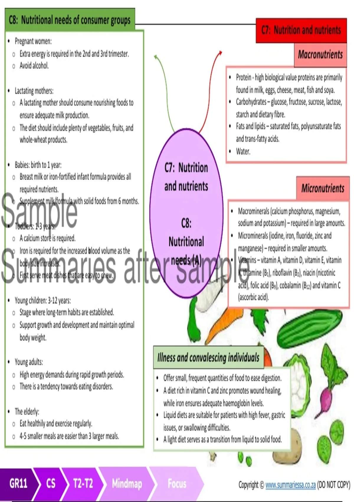 Grade 11 Consumer Studies Term 2 Summaries are composed using the "Focus" textbooks' work with examples and supplementary notes by compiler (external party). Contents: Topic 2:  Food and nutrition. Topic 5:  Housing and interior. Packages usually include the following but may differ from product to product: Overview for the term including main points, keywords and short summaries / revision. Mind map per chapter / topic / term depending on the volume. Extensive bulleted summaries in colour with pictures and / or photos.