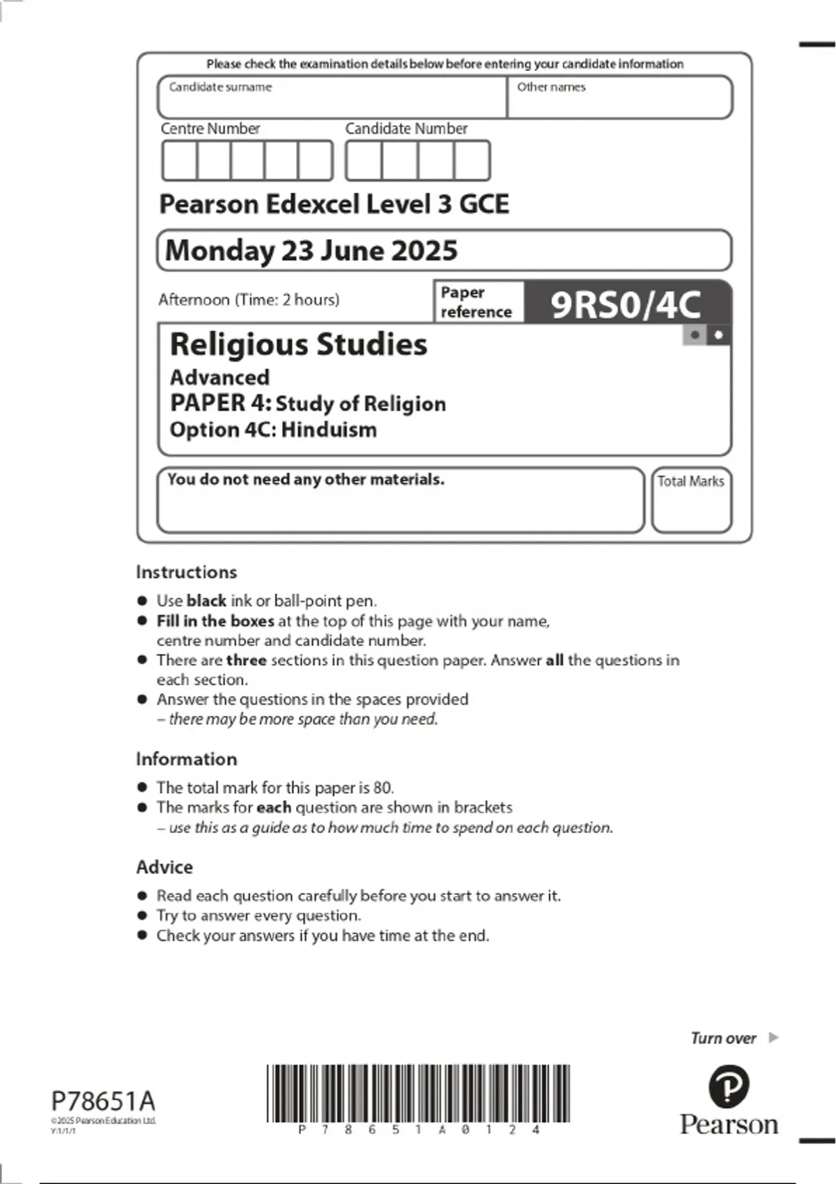 2025 Pearson Edexcel Level 3 GCE Religious Studies Advanced PAPER 4: Study of Religion Option 4C: Hinduism Combined Question Paper & Final Marking Scheme