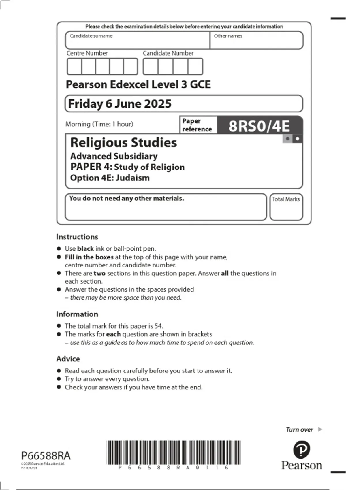 2025 Pearson Edexcel Level 3 GCE Religious Studies Advanced Subsidiary PAPER 4: Study of Religion Option 4E: Judaism Combined Question Paper & Final Marking Scheme