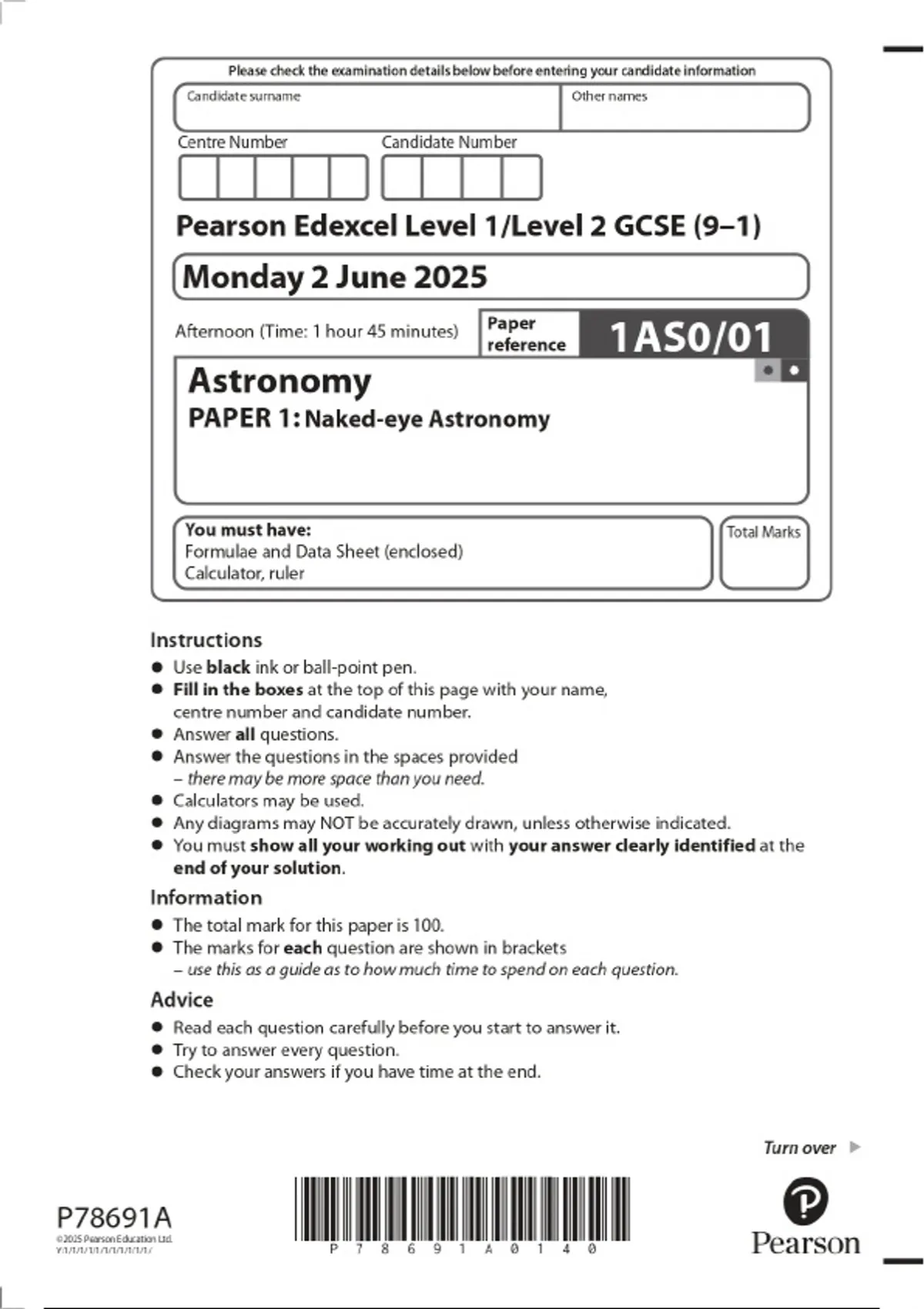 2025 Pearson Edexcel Level 1/Level 2 GCSE (9–1) Astronomy PAPER 1: Naked‑eye Astronomy Question Paper & Marking Scheme