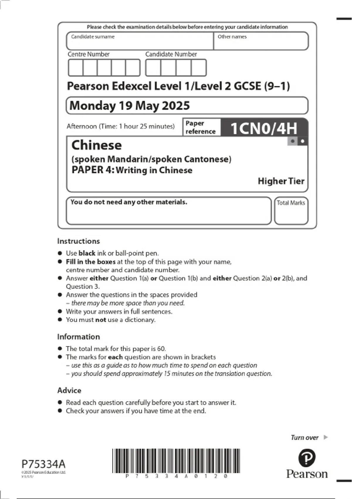 2025 Pearson Edexcel Level 1/Level 2 GCSE (9–1) Chinese (spoken Mandarin/spoken Cantonese) PAPER 4: Writing in Chinese Higher Tier Combined Question Paper & Marking Scheme