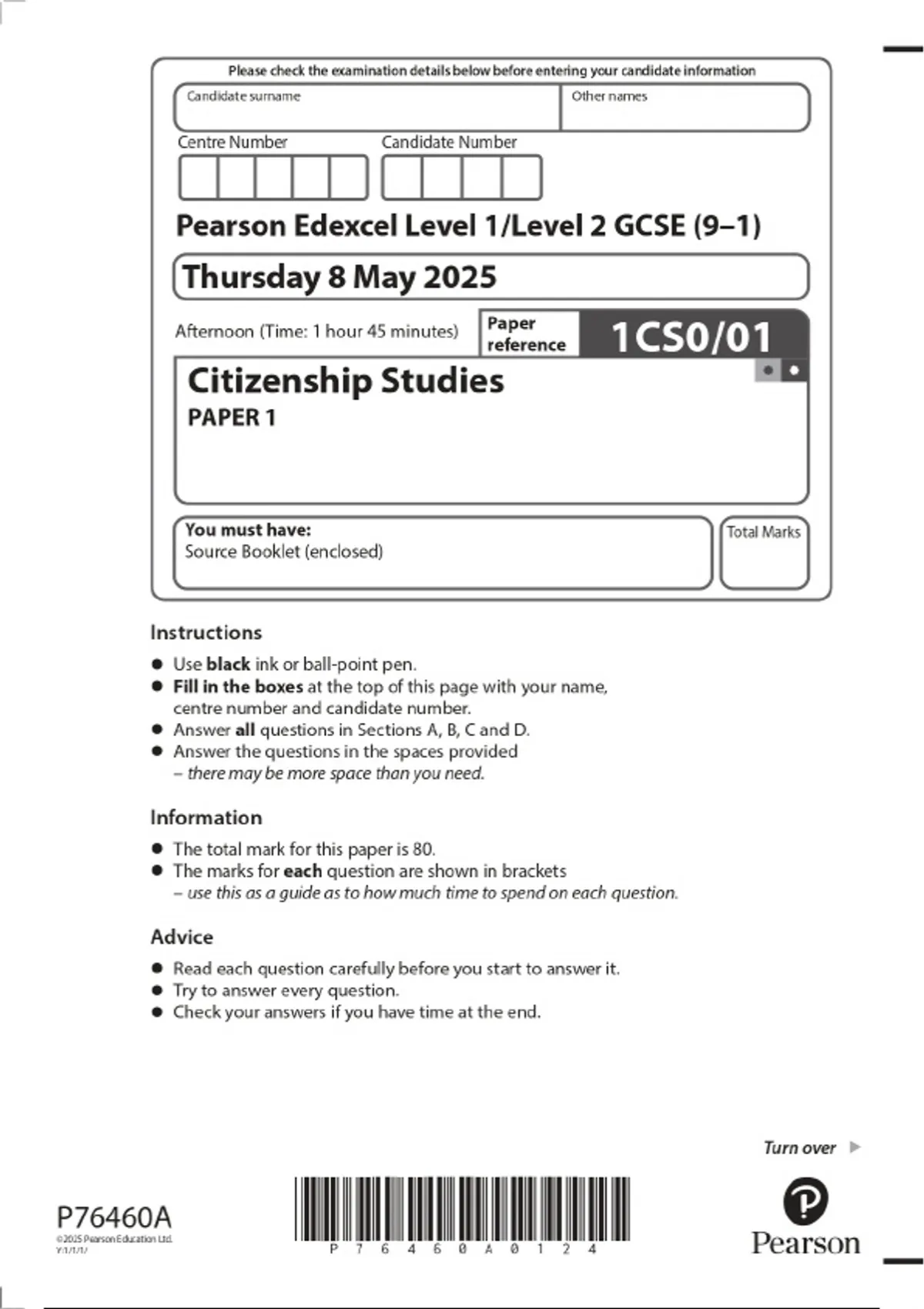 2025 Pearson Edexcel Level 1/Level 2 GCSE (9–1) Citizenship Studies PAPER 1 Combined Question Paper & Marking Scheme