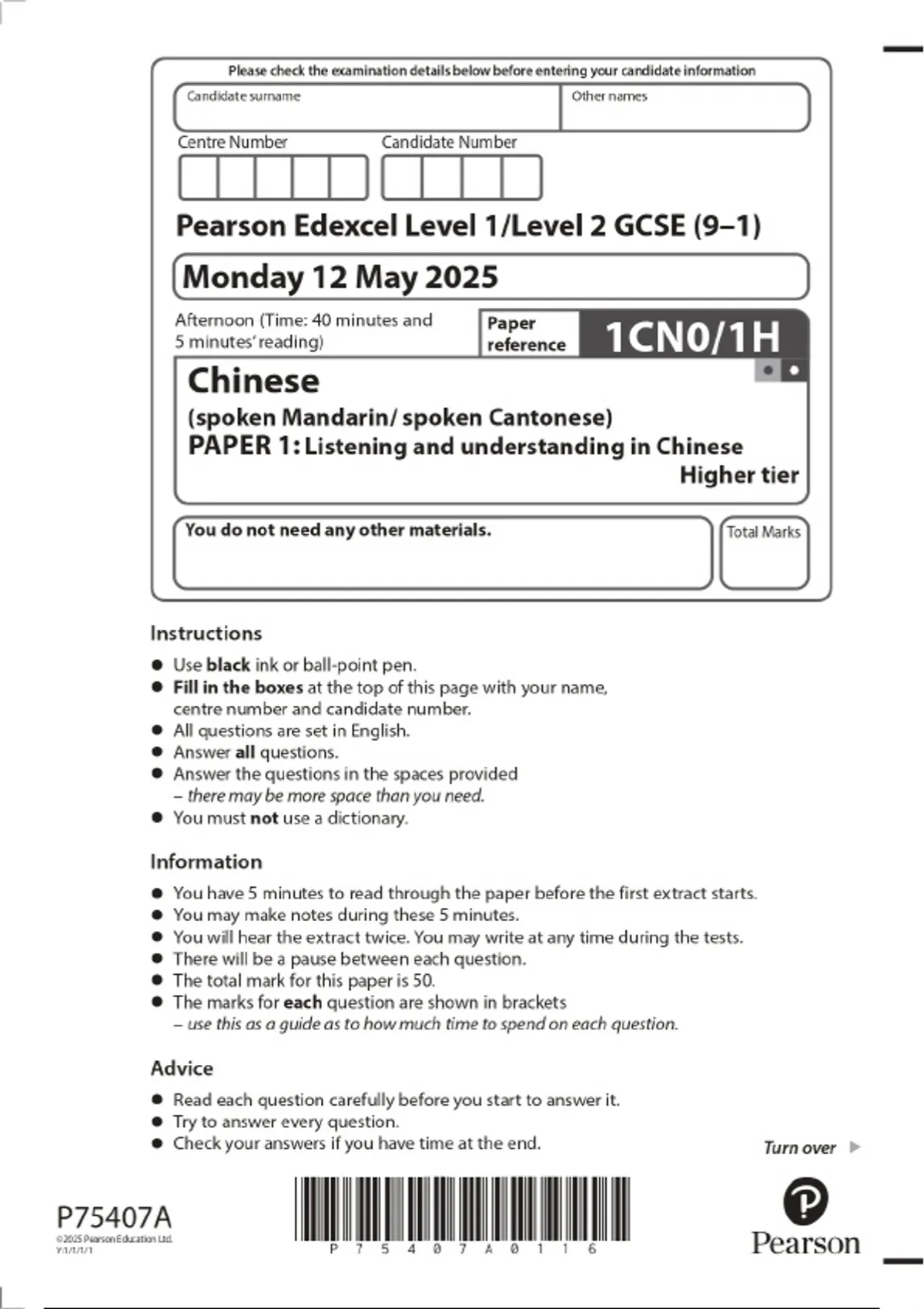 2025 Pearson Edexcel Level 1/Level 2 GCSE (9–1) Chinese (spoken Mandarin/ spoken Cantonese) PAPER 1: Listening and understanding in Chinese Higher tier Combined Question Paper & Marking Scheme