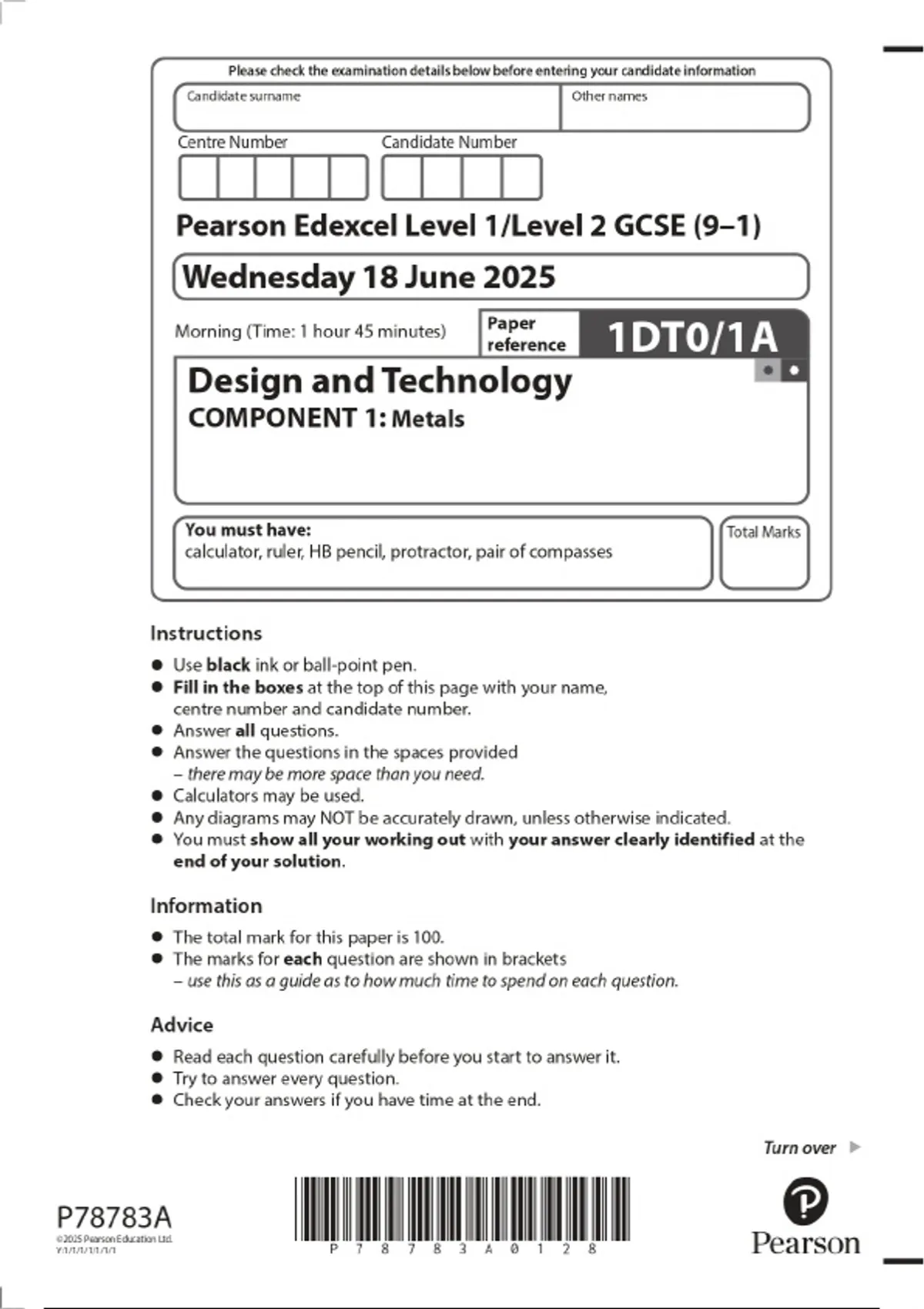 2025 Pearson Edexcel Level 1/Level 2 GCSE (9–1) Design and Technology COMPONENT 1: Metals Combined Question Paper & Marking Scheme