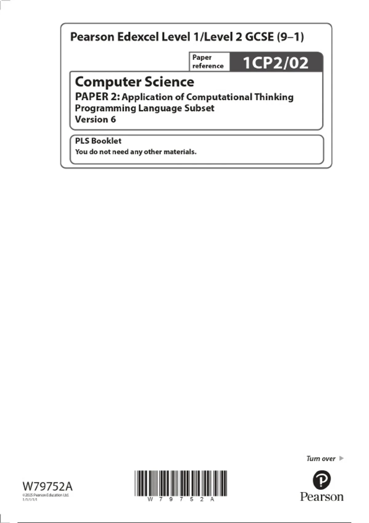 2025 Pearson Edexcel Level 1/Level 2 GCSE (9–1) Computer Science PAPER 2: Application of Computational Thinking Programming Language Subset Version 6 Combined Question Paper & Marking Scheme
