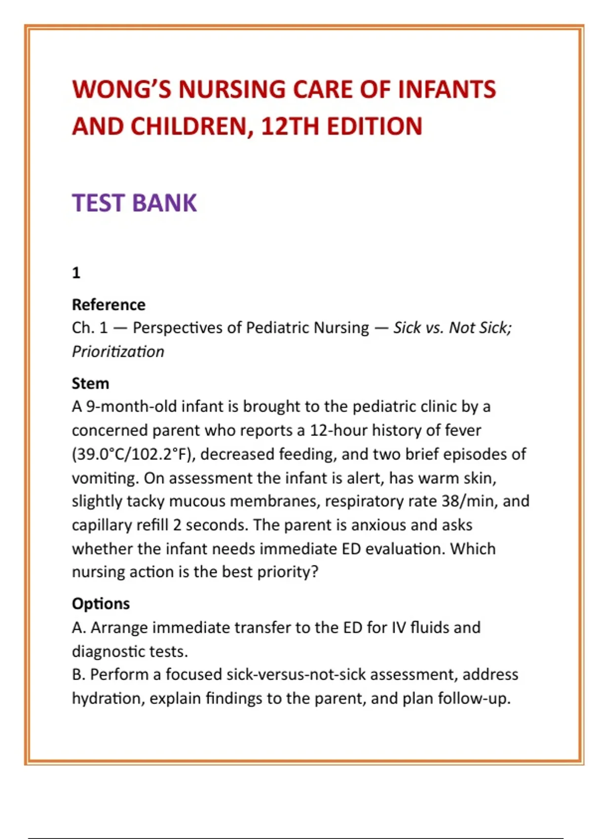 A focused sick-versus-not-sick assessment is the nursing priority