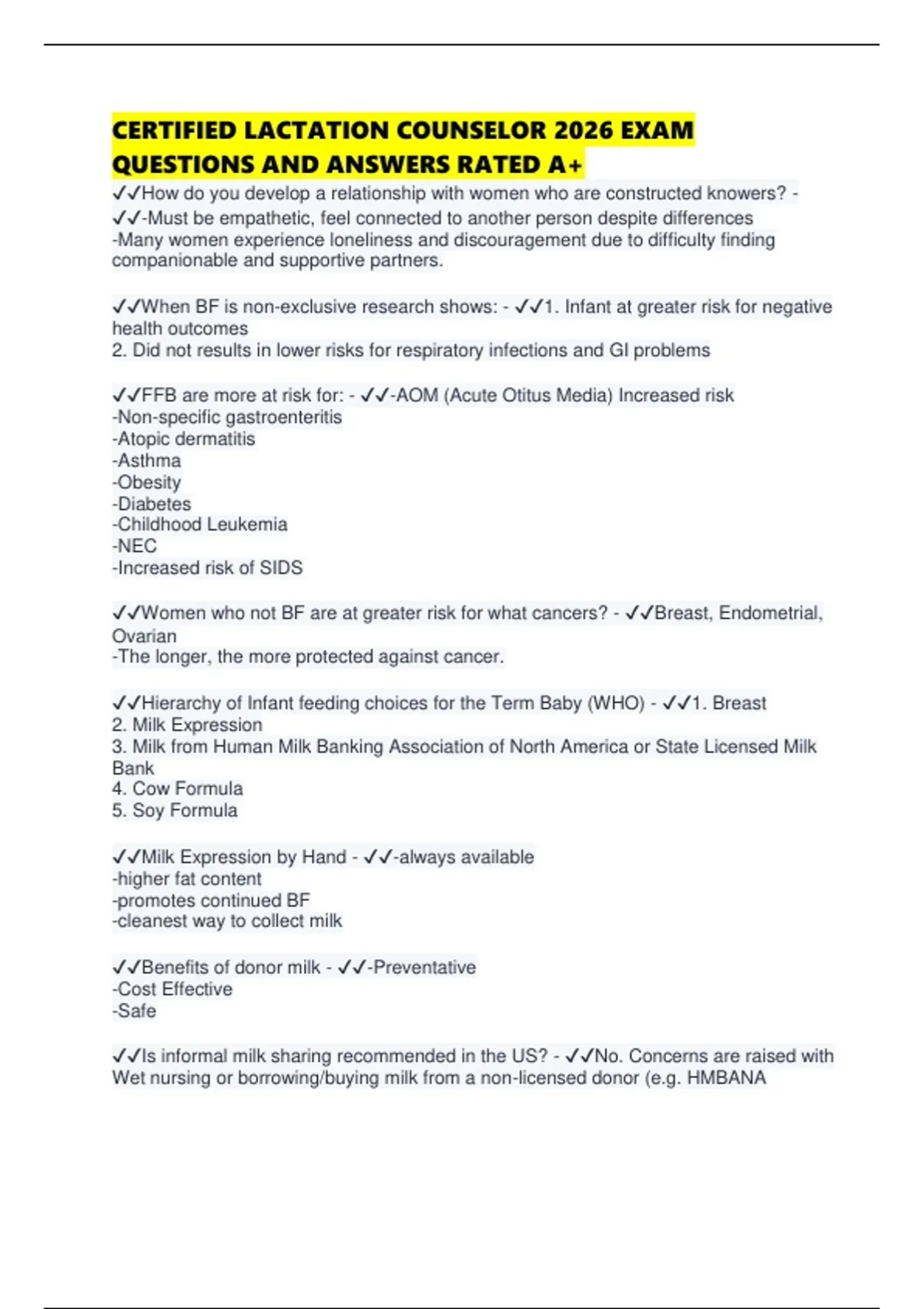 CERTIFIED LACTATION COUNSELOR 2026 EXAM QUESTIONS AND ANSWERS RATED A+