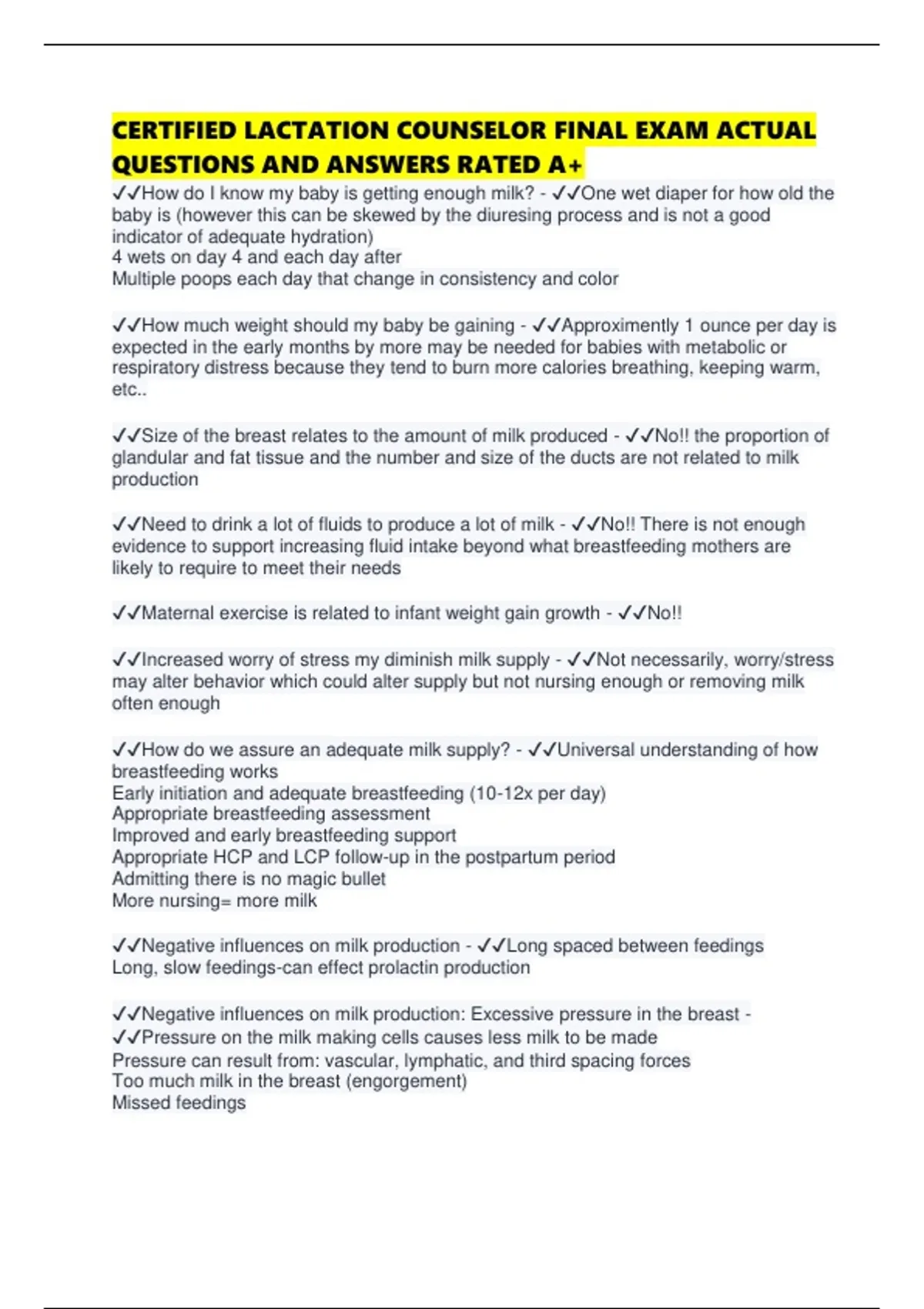 CERTIFIED LACTATION COUNSELOR FINAL EXAM ACTUAL QUESTIONS AND ANSWERS RATED A+