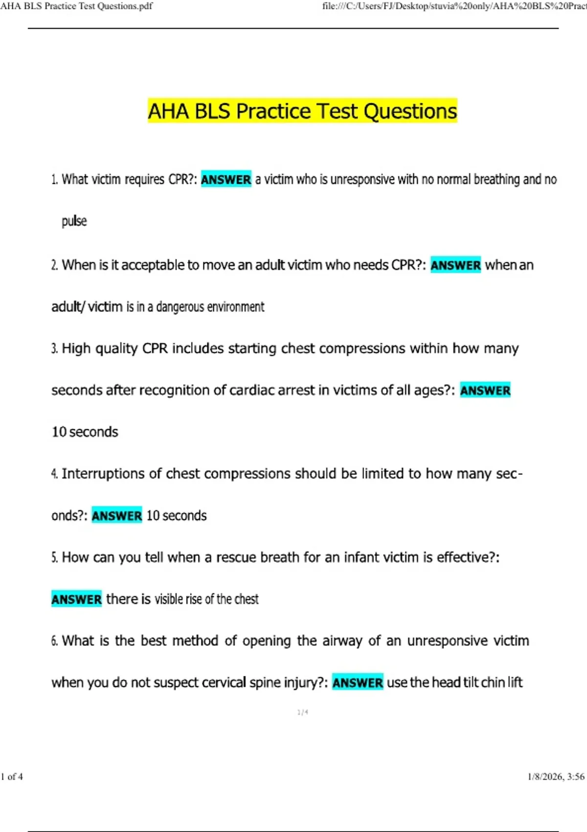 AHA BLS Practice Test Questions NEWEST 2026/2027 ACTUAL EXAM COMPLETE QUESTIONS AND CORRECT DETAILED ANSWERS (VERIFIED ANSWERS) |ALREADY GRADED A+||BRAND NEW!!
