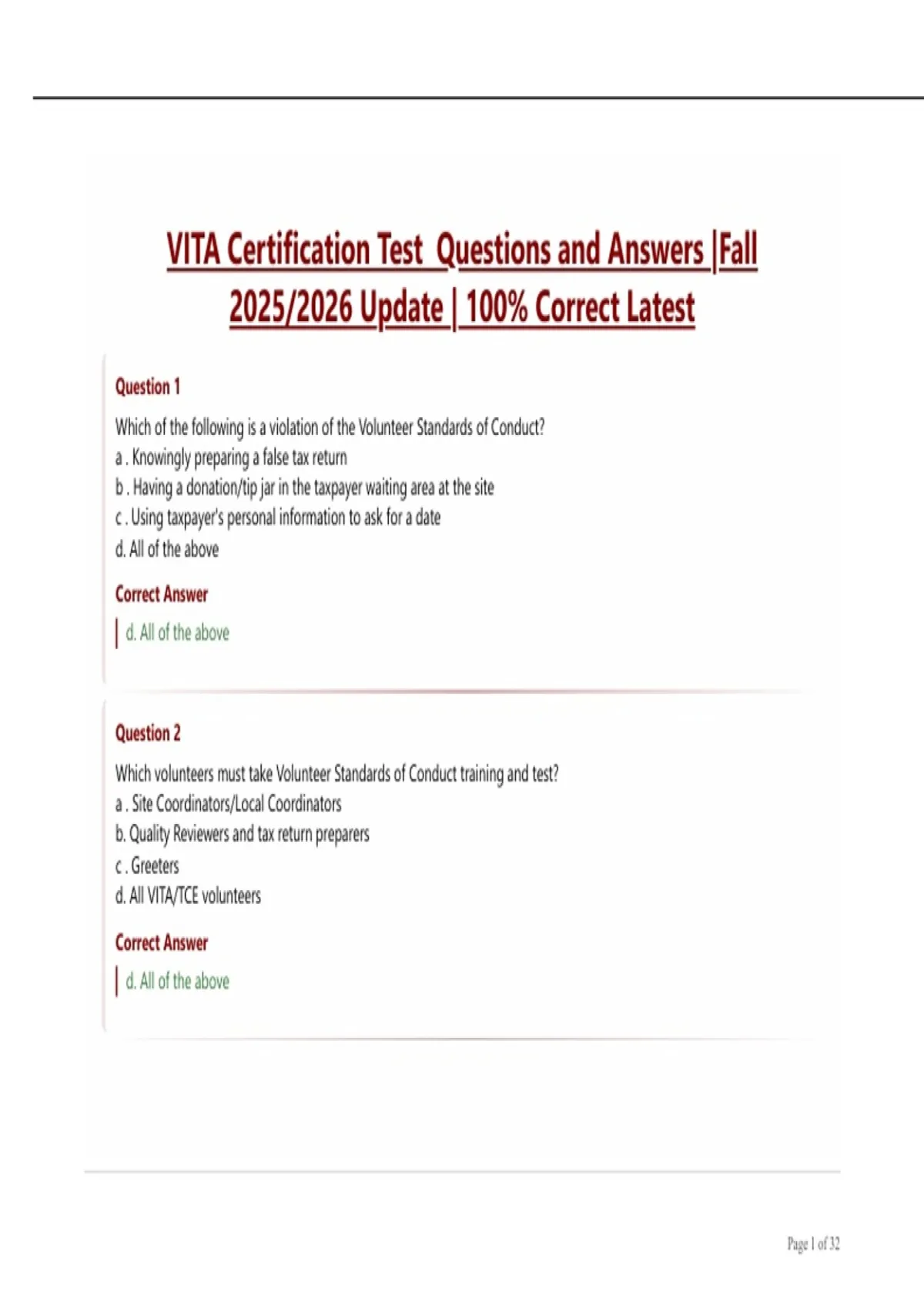 VITA Certification Test Questions and Answers |Fall