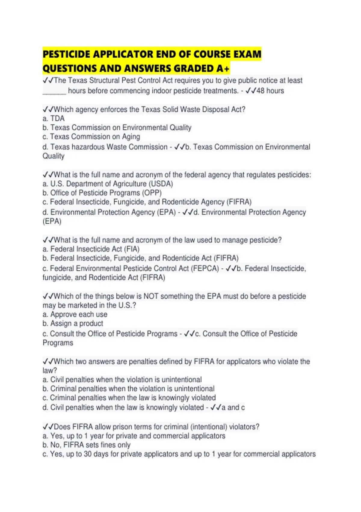 PESTICIDE APPLICATOR END OF COURSE EXAM QUESTIONS AND ANSWERS GRADED A+